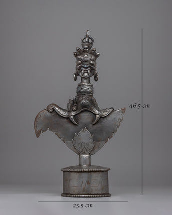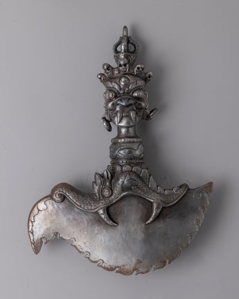 This expertly engraved Tibetan Kartika Knife is 46.5 cm in height and 25.5 cm in width, weighing 3.93 kg. The crescent-shaped blade, made of iron, represents the removal of attachments, ignorance, and barriers to enlightenment. The elaborate handle depicts a wrathful protector deity, possibly Mahakala, who represents divine authority and the ability to resist negative forces. Intricate dragon-like designs offer protective symbolism, but fire or lotus images promote purity and spiritual enlightenment, highlighting their importance in Vajrayana Buddhist rituals.