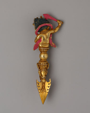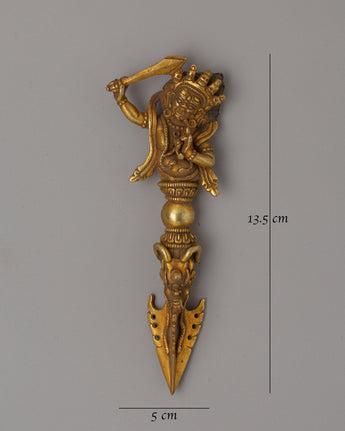 This handcrafted, gold-plated Tibetan Phurba Ritual Dagger is a stunning representation of Buddhist spiritual traditions. This sacred instrument, which measures 13.5 cm in height and 5 cm in width and weighs only 0.11 kg, is made of copper and has a stunning electro-gold plating. An essential ritual artifact in Tibetan Buddhism, the Phurba, also called Vajrakila, represents cutting ignorance and eliminating negative influences.