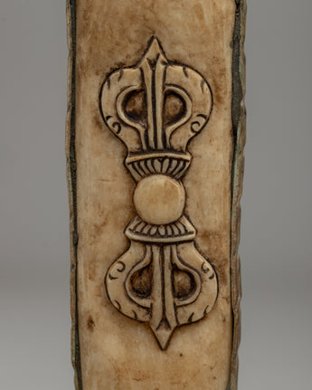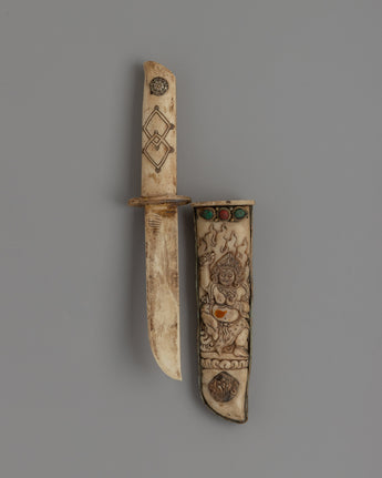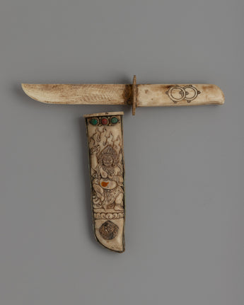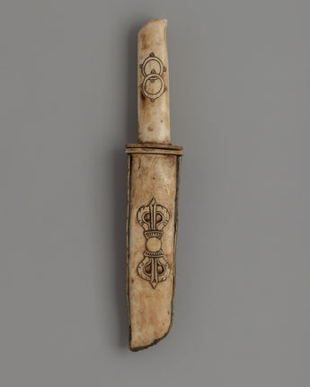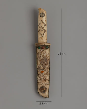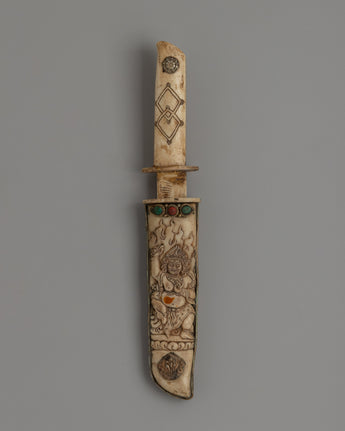 This magnificent Tibetan ritual knife, or Phurba, is hand-carved from responsibly sourced buffalo bone. Its complex design includes precise carvings of deities, which encapsulate Tibetan Buddhism's profound meaning. In traditional Tibetan ceremonies, the knife represents decreasing through ignorance and negativity, acting as a spiritual weapons in sacred practices.