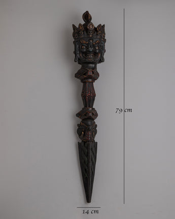 This stunning hand-carved wooden Phurba dagger is a sacred relic adored by Tantric Buddhists. This ceremonial dagger, known as Kila in Sanskrit, stands an amazing 79 cm tall and weighs 1.43 kg. It is a formidable tool for releasing negativity and neutralizing forces that restrict spiritual development. Its stunning carvings and powerful design represent Vajrakila's ancient iconography, which evokes spiritual force and protection.