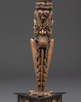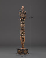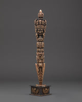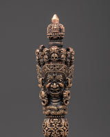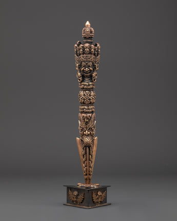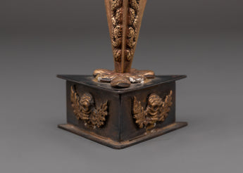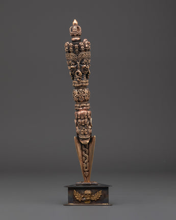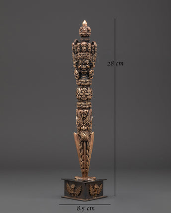 The handcrafted Himalayan Tibetan Phurba Dagger is a sacred ritual tool with profound roots in Tibetan Buddhism's esoteric traditions. This spiritually charged dagger, measuring 28cm tall by 8.5cm wide and weighing 1.21kg, is precisely crafted from copper with an iron base to represent strength, anchoring, and change. The Phurba, traditionally associated with Vajrakilaya the ferocious deity who dispels obstacles is said to channel high vibratory energy for dispelling negativity and grounding spiritual force.