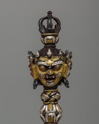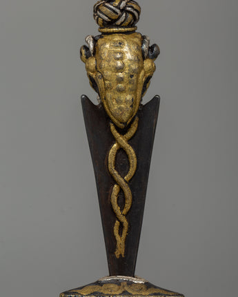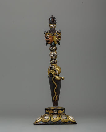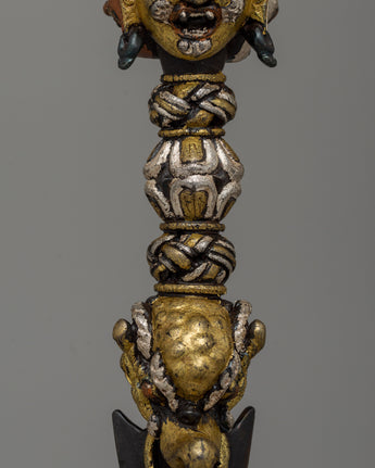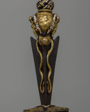 Embrace yourself in the spiritual essence of this Handcrafted Iron Phurba Dagger, a necessary weapon for Vajrayana Buddhist rites. Traditionally known as the Vajrakila, this ritual dagger is admired for cutting through negativity, eliminating negative forces, and securing spiritual energy. Crafted with an iron body and beautifully inlaid with copper, brass, and silver, this Phurba features elaborate workmanship, featuring strong protective deities and sacred iconography, making it a powerful item for practitioners and collectors.