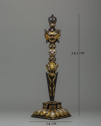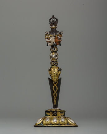 This Phurba stands 34.5 cm tall and is intended for meditation, energy purification, and tantric rites. The triple-sided blade denotes the removal of ignorance, attachment, and aversion, while the elaborate handle is embellished with traditional designs, symbolizing the heavenly wisdom and power of the divine.