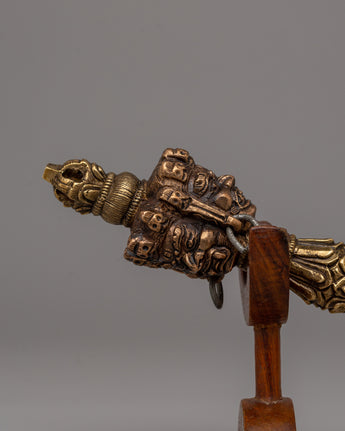 The dagger's superb hilt detailing demonstrates the talent and dedication of traditional craftspeople. Its three-sided blade aligns the user with spiritual harmony by cutting through ignorance, want, and hatred. The Phurba is a transformational symbol in Tibetan spiritual practice intended to eliminate negativity and obstacles. This exquisitely made Phurba is ideal for rituals and meditation or as a sacred ornament to raise the energy of your altar or meditation area.