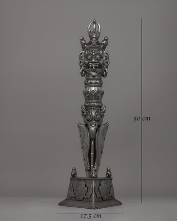 Discover the 50cm handcrafted iron Vajra Phurba, a stunning spiritual artifact based in Buddhist and Tantric traditions. This unique ritual dagger symbolizes the ability to eliminate negative energy, overcome barriers, and focus during meditation. Its elaborate design, with detailed engravings and construction, makes it both a useful spiritual instrument and a stunning work of art. This Vajra Phurba, which reflects Himalayan culture and spirituality, is ideal for altars, meditation spaces, or as a statement décor piece.