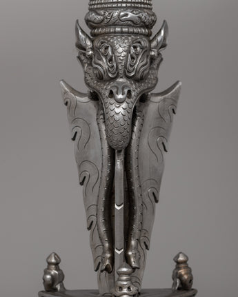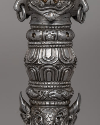 Crafted entirely of iron and weighing an incredible 4.56kg, this Phurba highlights the mastery of Himalayan artisans. Its high details and classic design evoke centuries of cultural legacy, making it an essential addition to any spiritual practice or collection.