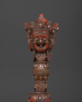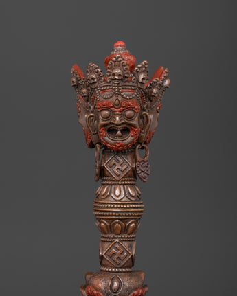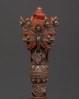 This handcrafted Phurba Dagger is a treasured Tibetan ritual tool specifically designed to aid in spiritual rituals. It is 31cm tall and boasts a realistic god figure design, symbolizing the profound cultural significance of Tibetan spirituality. The agger, made of copper, shows the skill of Himalayan artists. Thi ceremonial tool is more than just a decorative piece; it is a practical artifact with deep spiritual significance, suitable for both meditation and ritualistic application.