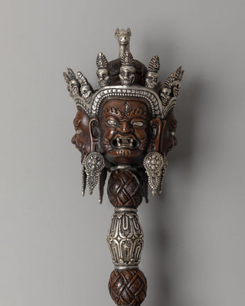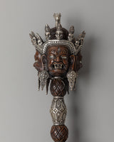 This exquisitely carved Tibetan Phurba (ritual dagger) combines holy elegance with oxidized copper that has been silver-plated. Each piece is expertly made by talented craftspeople using traditional Himalayan designs, guaranteeing both spiritual purity and authenticity. The dagger has a commanding appearance due to its dimensions of 52 cm in height, 11.5 cm in width, and a considerable weight of 4.00 kg. From the three-sided blade to the elaborate handle, its fine details are a reflection of centuries of spiritual symbolism and ritual artistry.