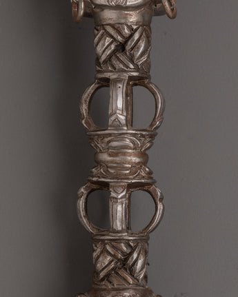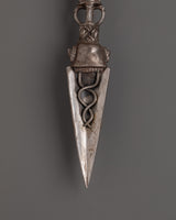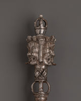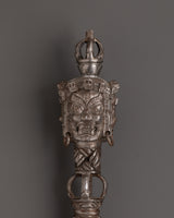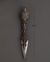 The Phurba revolves around a Dorje (Vajra) handle, which represents the union of compassion and knowledge. Below it, the triple-bladed naga (serpent) blade spirals with energy, a traditional pattern thought to bind and pin down obstacles, demons, and negative energies. This dagger's sheer weight and iron composition make it more than just symbolic; it is also energetically grounding, serving as an accurate ritual instrument for serious practitioners, ceremonial leaders, and ardent collectors of Tibetan antiques.