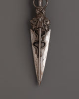 The ceremonial dagger (Sanskrit: Kila; Tibetan: phurba) is essential for the expelling of evil and is thought to be especially effective in neutralizing the forces that obstruct Tantric Buddhist practice. It has ancient origins, first appearing in the Indian Rig Veda as the core blade of the vajra used by Indra to destroy the primordial cosmic snake Vritra. Kila, which means peg or stake in Sanskrit, was most likely associated with Vedic sacrifices. Meditation on the Vajrakila Tantra, an early Indian scripture first promoted in Tibet in the eighth century by Padmasambhava, one of the founding teachers of Tibetan Buddhism, is used to invoke the three-headed Vajrakila Buddha.