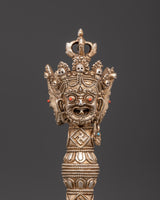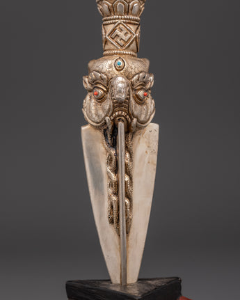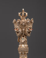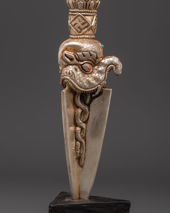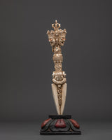 This magnificent piece is created from copper and meticulously silver-plated, providing both visual brilliance and ceremonial value. The Phurba's triple-bladed design symbolizes the removal of the three root poisons: attachment, aversion, and ignorance. The handle is decorated with finely sculpted wrathful god heads, most of which depict Vajrakilaya, the fierce protector of the Dharma. The crowns of skulls represent transcendence over worldly attachments, while the central vajra represents unbreakable spiritual force. A lotus pedestal supports the base, symbolizing purity and spiritual uplift.