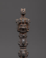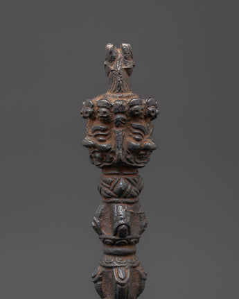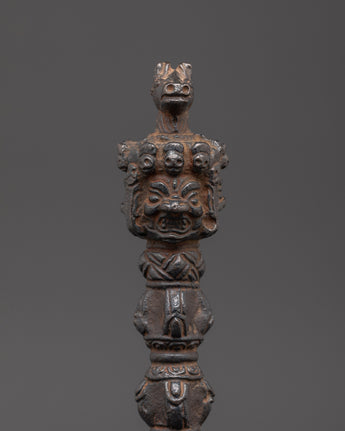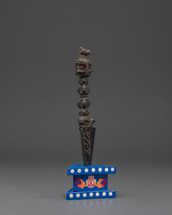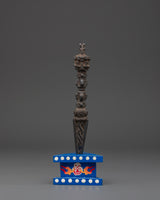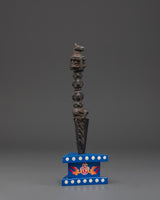 The three-bladed design represents the transmutation of the three poisons—ignorance, attachment, and aversion—into wisdom. Used by monks, shamans, and advanced practitioners, the Phurba is believed to cut through negative energies, dispel spiritual obstacles, and anchor sacred space. This intricately crafted piece reflects authentic Himalayan artistry and is a valuable addition to any tantric toolkit or personal meditation shrine.