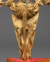 The intricate design showcases Himalayan craftsmanship, with the deity's six arms clearly visible - two holding the traditional phurba blade. In contrast, others grasp vajras and tridents representing different aspects of enlightened activity. The wooden base features vibrant lotus petals in conventional colors of red, blue, green, and gold, symbolizing the pure foundation from which enlightened wisdom emerges. Every detail maintains the sacred proportions essential to authentic Vajrakilaya representations.