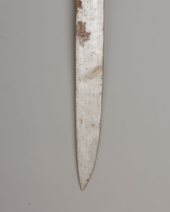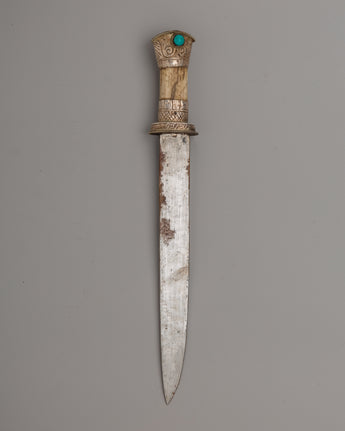 A Tibetan knife, also called a "phurba" or "kila," has cultural and symbolic meaning in Tibetan traditions. The unique three-sided blade of this ceremonial dagger represents the victory over ignorance, desire, and aversion in Buddhism. Tibetan knives, adorned with elaborate carvings and frequently have a tripartite handle representing different gods, are essential to religious rites, ceremonies, and spiritual practices. In addition to their spiritual significance, these knives might have practical uses in daily life, exhibiting a combination of deep cultural symbolism and usefulness in Tibetan communities.
