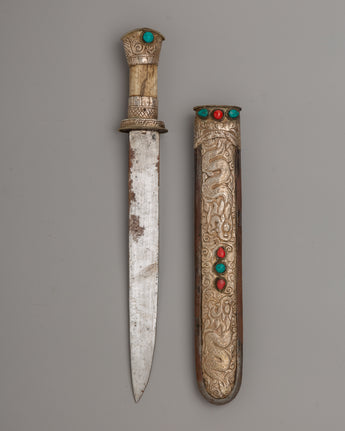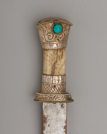 The blade remains in the background and is framed by an opulent silver-embossed iron handle. The overall design has a striking presence, combining utility and symbolic meaning. The inclusion of coral and turquoise, both of which have cultural and spiritual significance, emphasizes the knife's status as a tool and an artifact imbued with meaning. This is more than just a blade; it is a work of art that depicts the Himalayas' cultural richness and intricate craftsmanship.