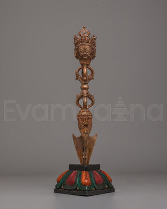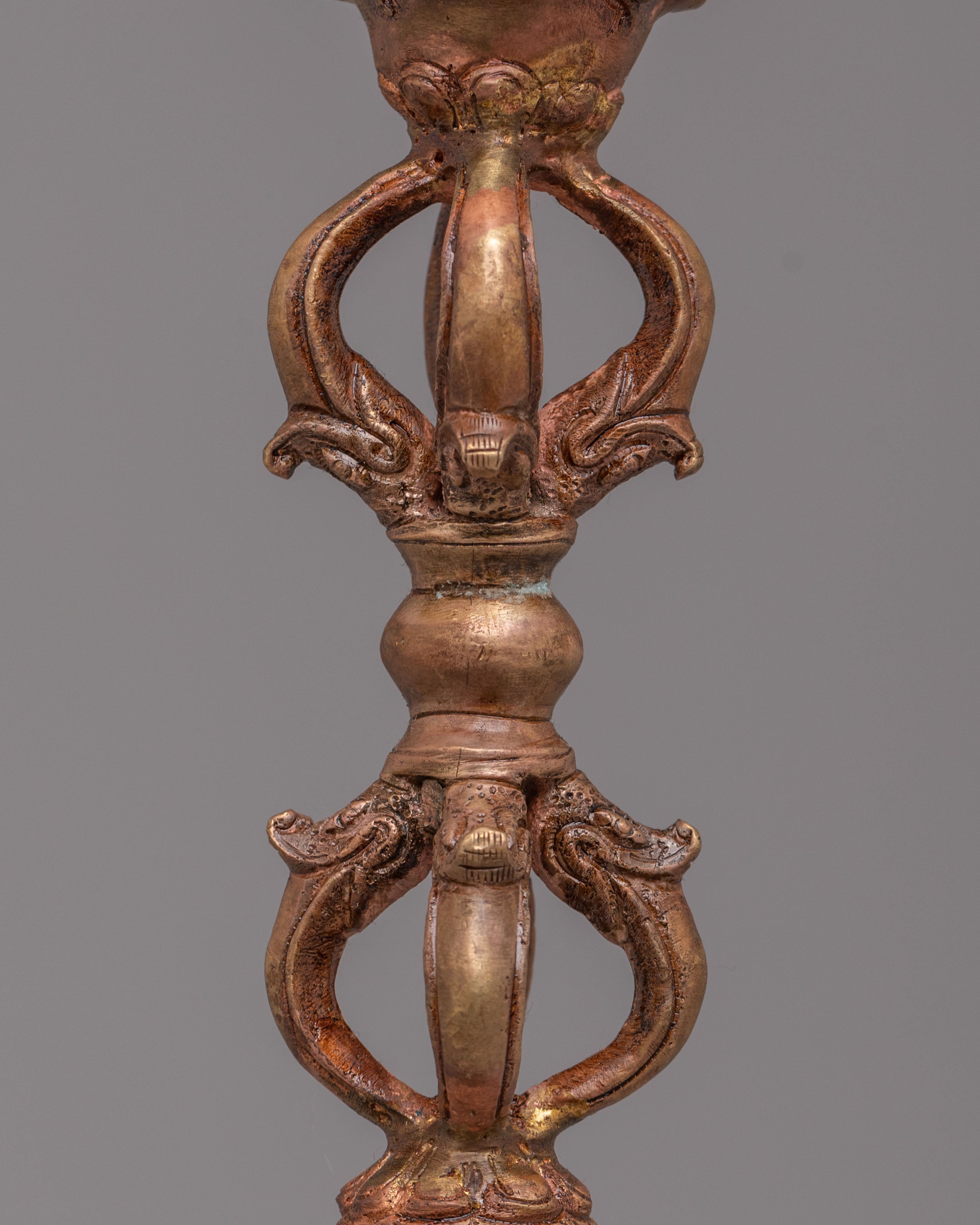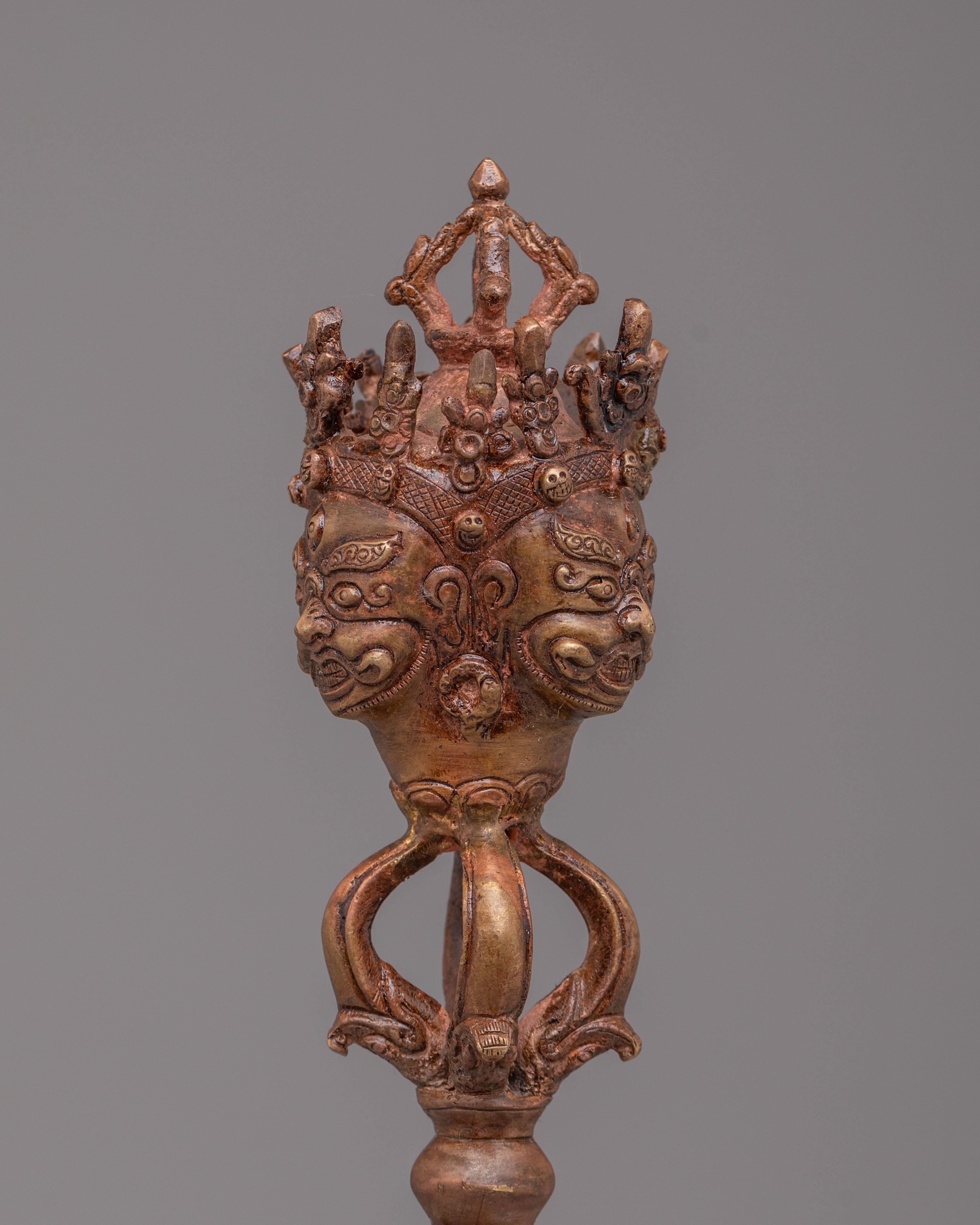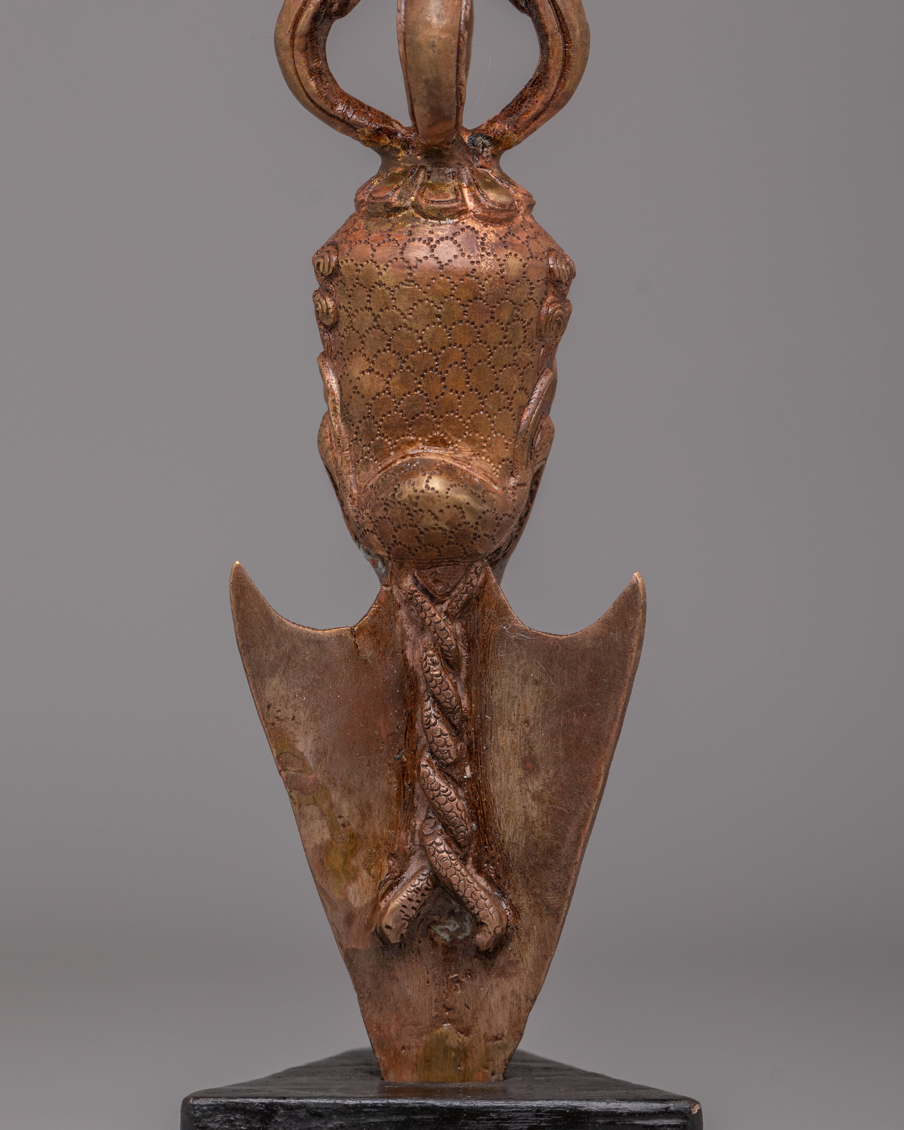 Crafted from copper for the blade and wood for the handle, the Himalayan Phurba Dagger features a distinctive design with intricate carvings reflecting traditional Tibetan Buddhist motifs. The blade represents the strength to cut through obstacles, while the handle signifies grounding and connection with the Earth. The detailed craftsmanship underscores the phurba's spiritual significance, making it not just a ritual tool but a work of art that resonates deeply with Tibetan spiritual practices.