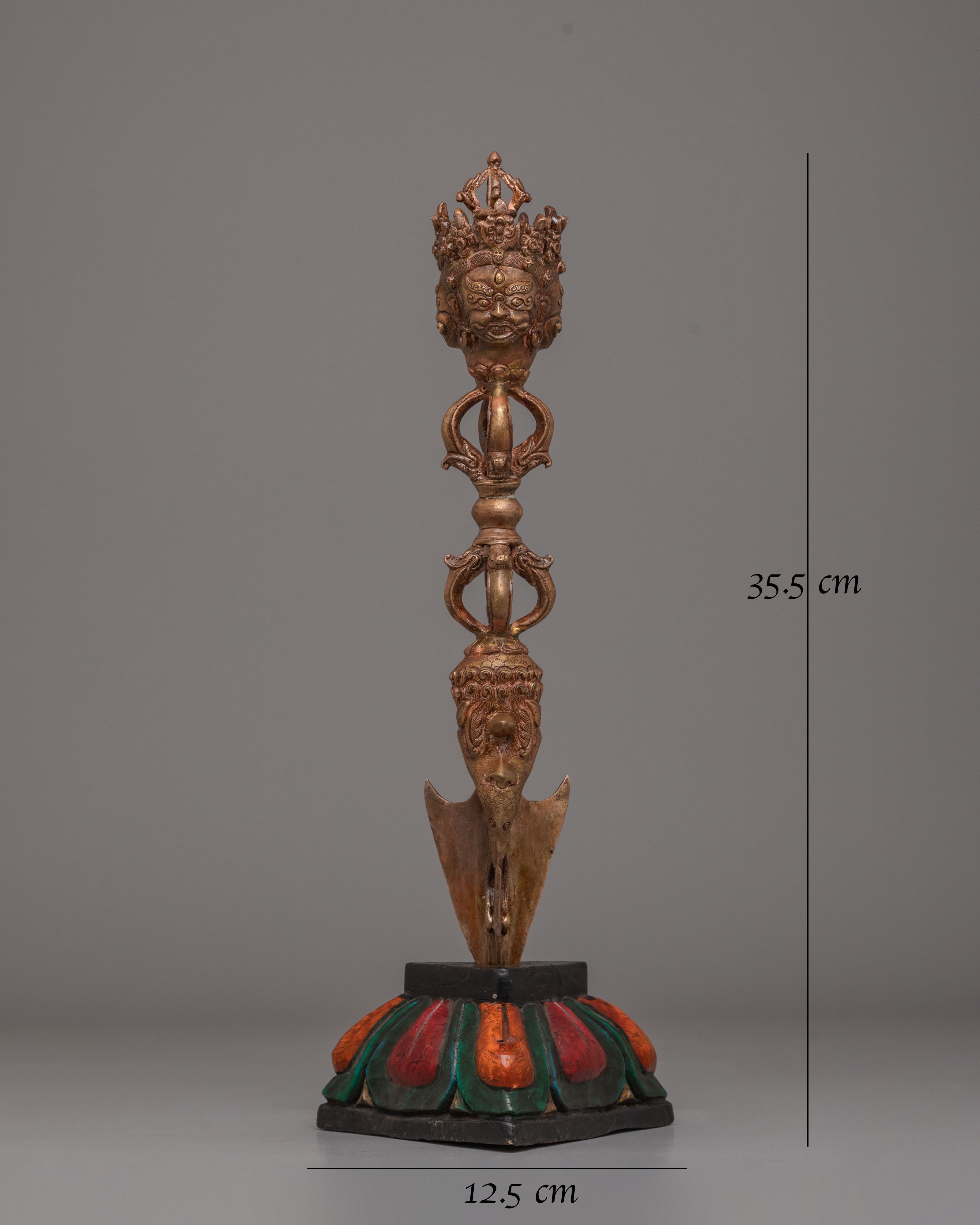 The Handcrafted Himalayan Spiritual Phurba Dagger is a powerful symbol of protection, transformation, and spiritual strength. Measuring 35.5cm in height and 12.5cm in width, this oxidized copper, wood, and gold-plated phurba weighs 0.89kg, offering a perfect blend of strength, elegance, and spiritual significance, and a well-balanced, impactful presence. Traditionally used in Tibetan Buddhist rituals, the phurba is believed to cut through negative energies and obstacles, allowing for the release of spiritual blockages and the purification of one's environment. This sacred dagger embodies the essence of Tibetan spiritual power and protection.