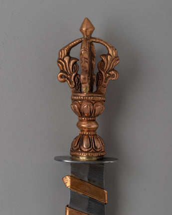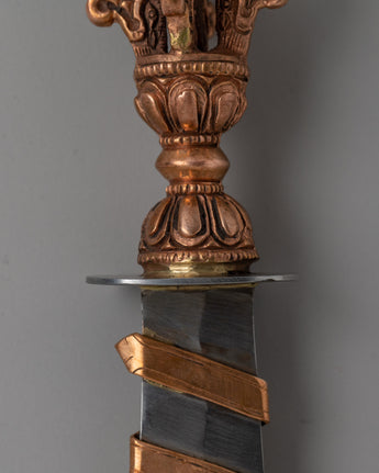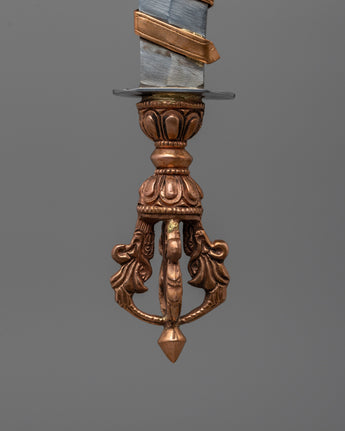 Ritual tools are vital equipment of Tibetan Vajrayana Buddhism practice, meant to dispel misconceptions that obstruct enlightenment. The phurba (Sanskrit: Kila) blade seen here was created to symbolically swallow the three poisons that obstruct spiritual progress: ignorance, greed, and illusion. The Phurba is the physical manifestation of the Vajrakila Buddha, who has the ability to destroy all evil on the earth. Its ceremonial usage is first recorded in the Vajrakilaya Tantra, an eighth-century or older Vajrayana work.