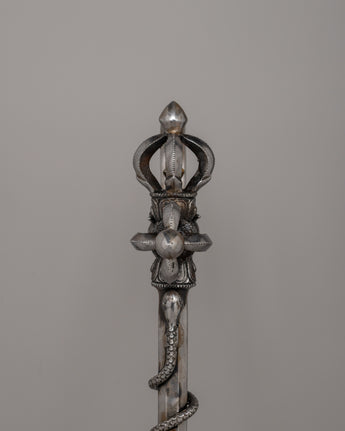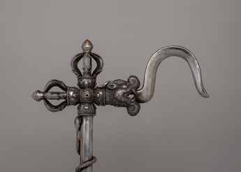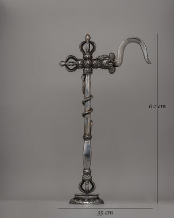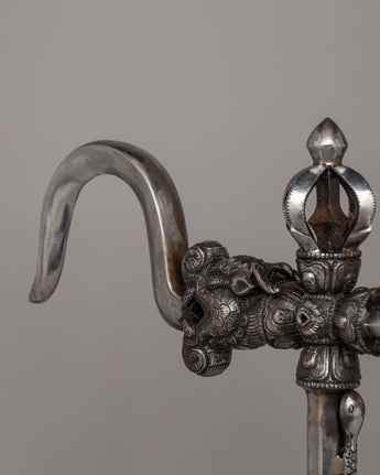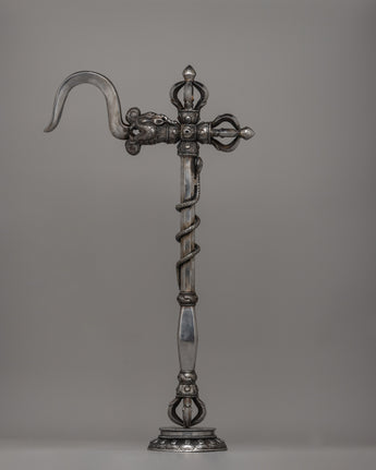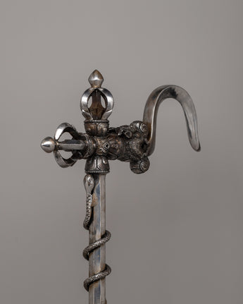 This ritual hook (Ankush) resembles the tool used by mahouts to keep elephants under control. According to its Buddhist ritual purposes, multiple half vajras are affixed to its handle, and its blade emerges from the mouth of the Makara sea monster. The hook is commonly utilized as part of the power activities of tantric rituals that try to subdue and tame entities via brilliance. It is most usually wielded by red deities linked with these activities, such as the Dakini Kurukulla or Ganapati, the Buddhist equivalent of Ganesh, the well-known elephant-faced god.