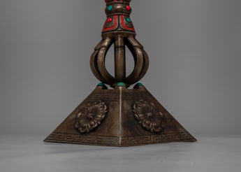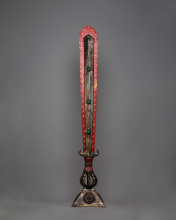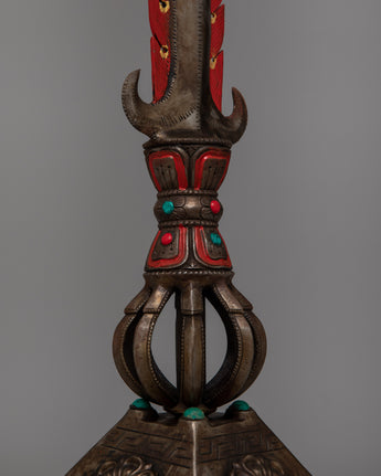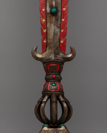 Ritual tools are vital equipment of Tibetan Vajrayana Buddhism practice, meant to dispel misconceptions that obstruct enlightenment. The phurba (Sanskrit: Kila) blade seen here was created to symbolically swallow the three poisons that obstruct spiritual progress: ignorance, greed, and illusion. The Phurba is the physical manifestation of the Vajrakila Buddha, who has the ability to destroy all evil on the earth. Its ceremonial usage is first recorded in the Vajrakilaya Tantra, an eighth-century or older Vajrayana work.
