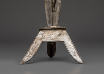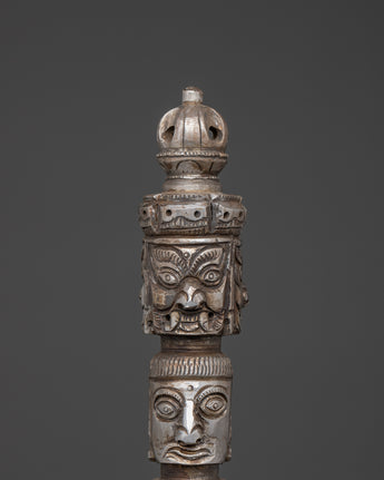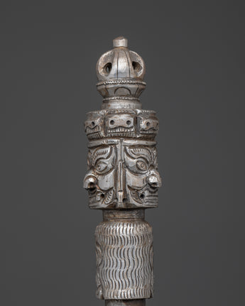 With this finely crafted iron Tibetan Phurba, a ceremonial dagger used in Vajrayana Buddhist ceremonies to remove negativity and transform iron-made spiritual energy, you can invoke the ancient strength and sacred protection of Tibet. This Phurba is made entirely of iron, giving it an intimidating appearance. It measures an excellent 47 cm in height and 15 cm in breadth. The Phurba, a potent spiritual instrument used in ceremonies, meditation, and rituals, has long been employed by monks, shamans, and tantric practitioners. It represents the slicing through of ignorance and ego.