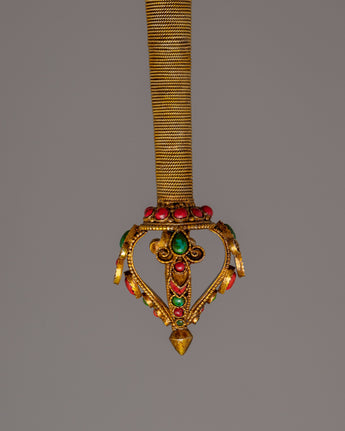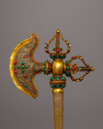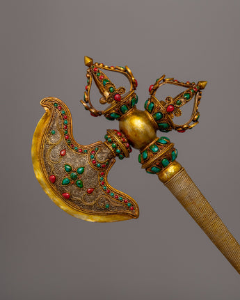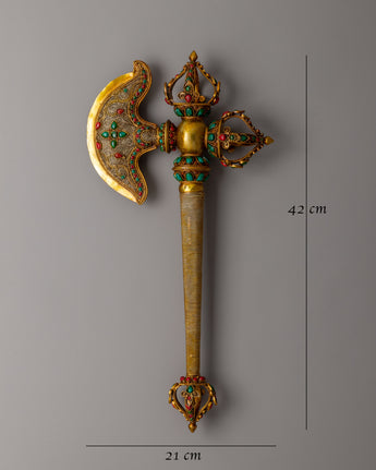 The Kartika axe, the ritual flaying knife, is considered a sacred implement in Hindu and Buddhist traditions, notably Vajrayana Buddhism. It has a crescent-shaped blade with a vajra grip, which represents removing ignorance, attachment, and worldly illusions. Often connected with deities like Vajrayogini and Mahakala, the Kartika is employed in ceremonies to represent transformation and spiritual emancipation. Traditionally made of metals like bronze or iron, it is a symbolic and functional object during ceremonies. The Kartika axe, representing wisdom and the severing of harmful elements, is valued as a potent tool for divine protection and enlightenment.