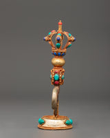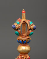 This mantra-engraved Kartika Knife, standing 19 cm tall with a width of 12 cm and weighing 0.292 kg, is beautifully crafted from copper and gold-plated materials—the knife's top features a half vajra, symbolizing the union of wisdom and compassion. The upper part of the curved knife is intricately floral carved, adding delicate detail to its functional form. The base of the knife is curved, highlighting the elegant symmetry of the overall piece. Adding semi-precious stones such as Lapis Lazuli, Coral, and Turquoise further enhances its aesthetic appeal.