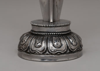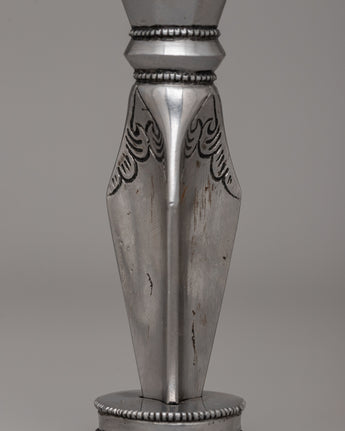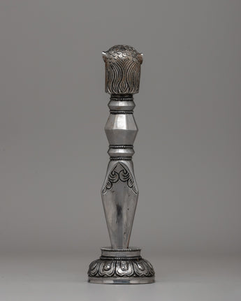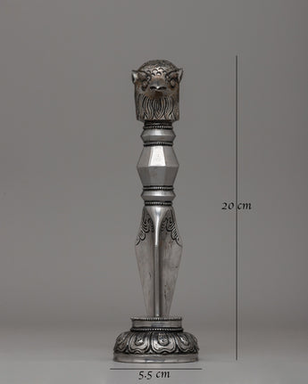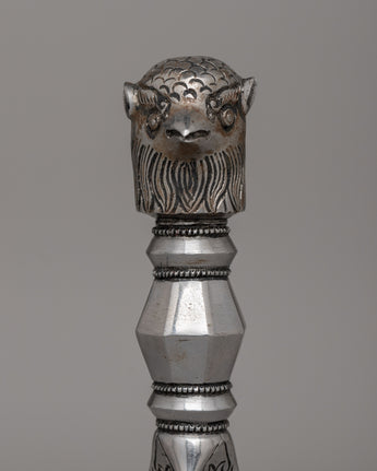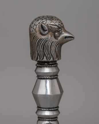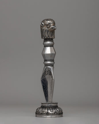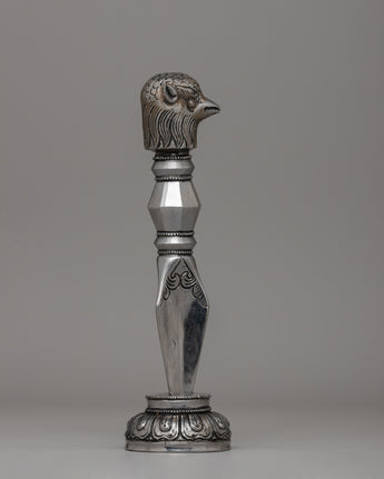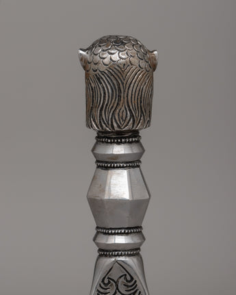 This Phurba is not just a symbolic tool used in Tibetan Buddhist ceremonies to remove negativity and barriers, but it is also a stunning work of art. The crisp geometric lines, along with the intricate owl design, make this a standout item for collectors, practitioners, or anyone interested in the cultural and spiritual richness of traditional Tibetan artwork. It demonstrates the confluence of usefulness and artistic expression in ceremonial implements.
