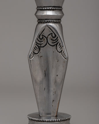 The Owl Head Iron Phurba is a stunning work of craftsmanship, totally hand-carved from iron. This sacred ceremonial dagger is 20 cm tall, 5.5 cm wide, and weighs 0.64 kg. It emits a powerful presence. Its design includes a beautifully sculpted owl head at the top, which represents knowledge and protection, as well as exquisite carvings down the body that provide spiritual importance and aesthetic appeal. The base is embellished with exquisite motifs that showcase the artisan's skill.
