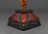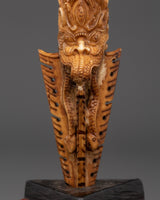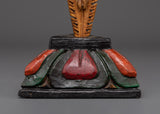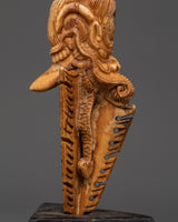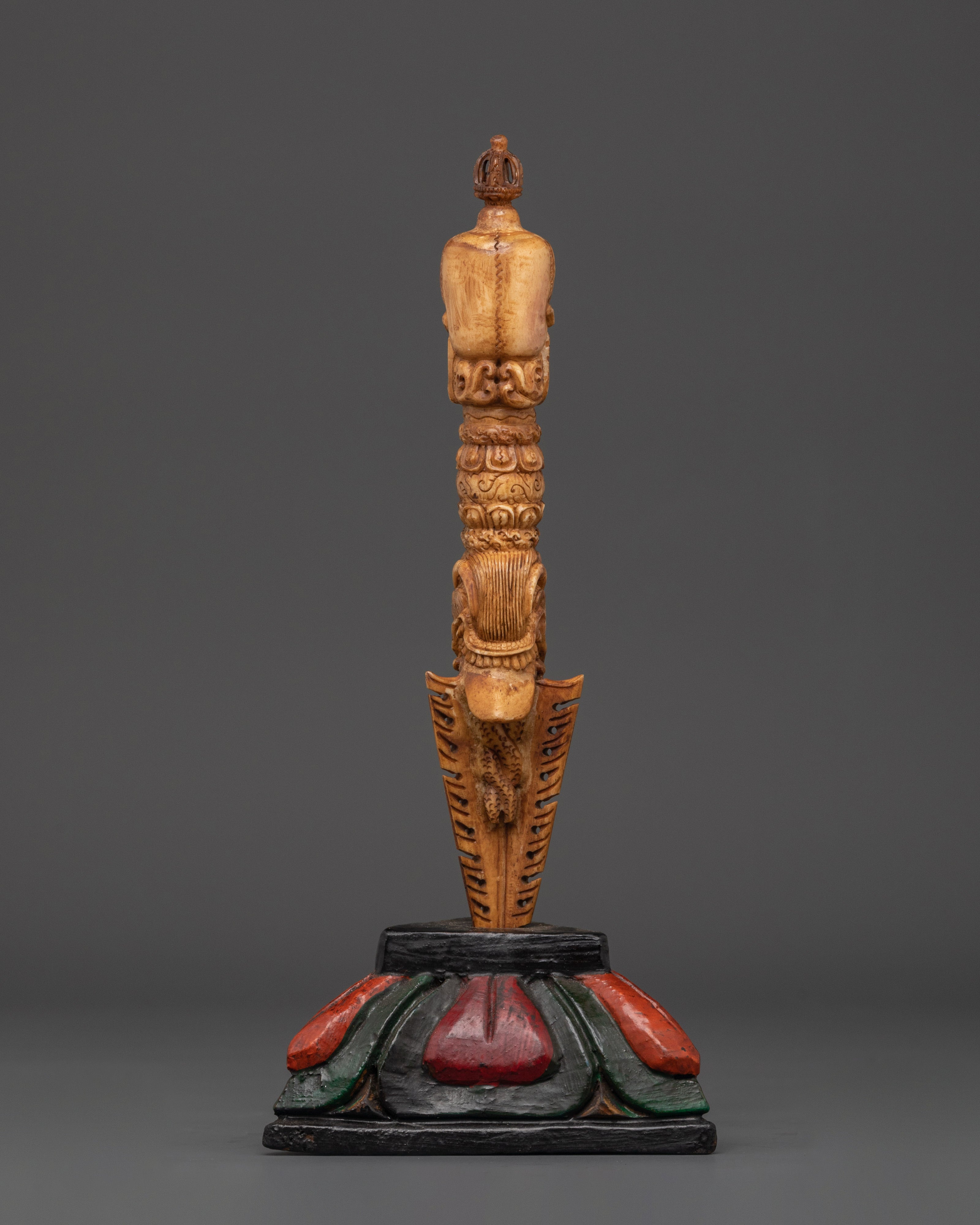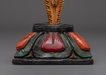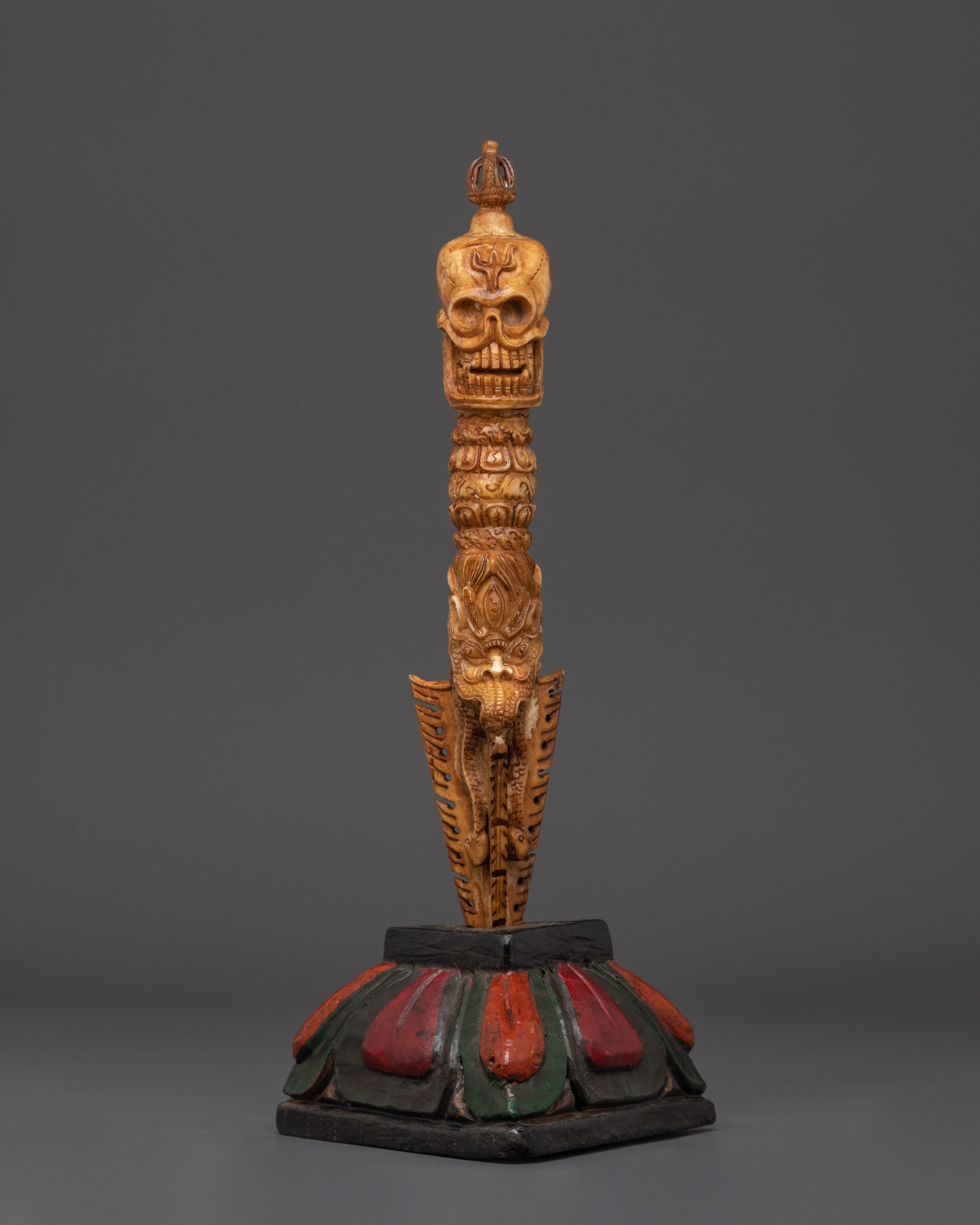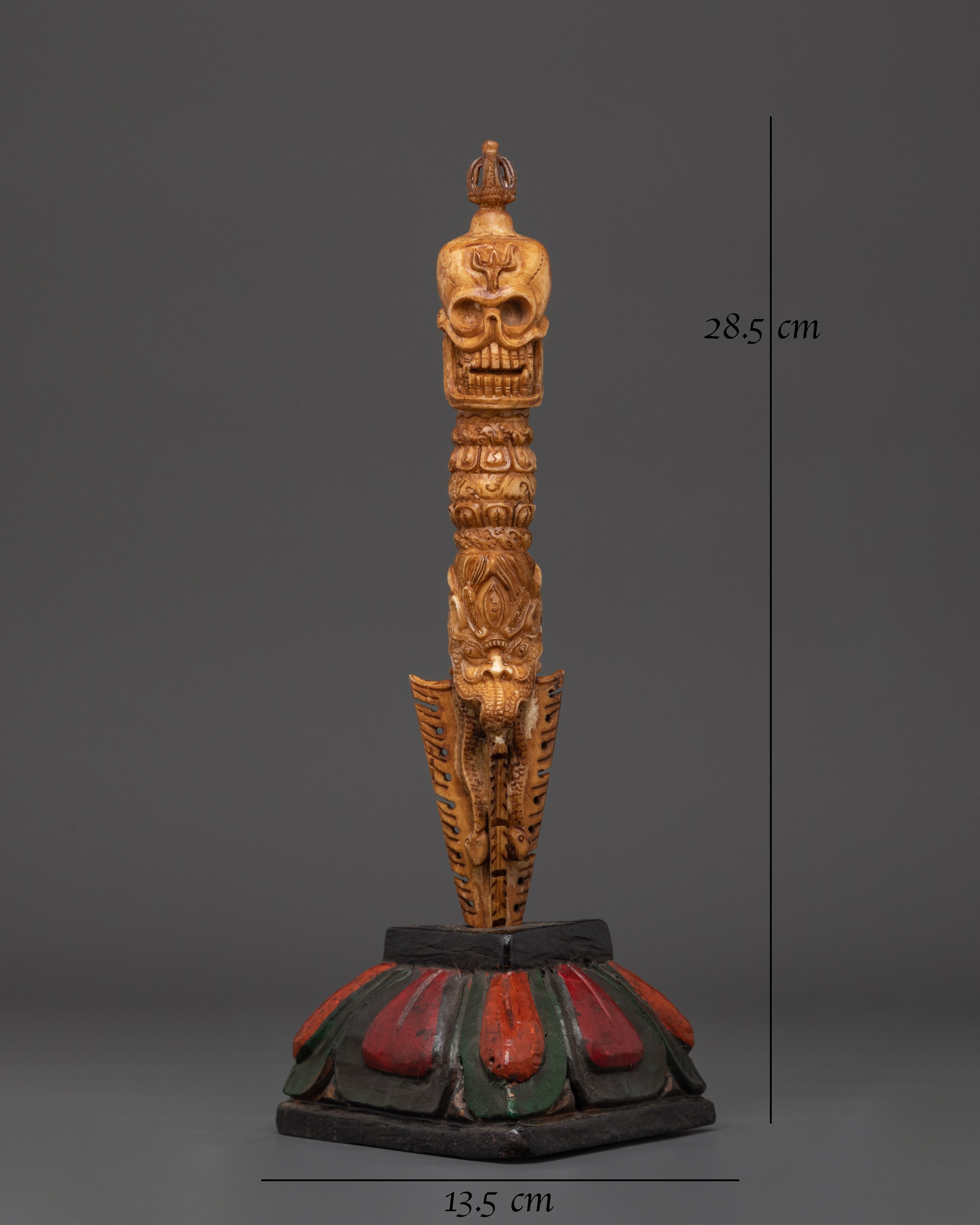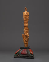 This Phurba Dagger with Skull Top, a holy Tibetan ritual instrument fashioned from wood and hand-painted with acrylic color, transmits protective energy and spiritual authority.  This dagger is lightweight yet symbolically potent, measuring 28.5cm in height and 13.5cm in breadth and weighing only 0.28kg.  The three-sided blade and finely sculpted skull top represent cutting through the "three poisons" of ignorance, attachment, and aversion, resulting in spiritual enlightenment and energetic balance.  Every curve and detail on this dagger is handcrafted, representing traditional Tibetan workmanship and honoring the strong guards of the Dharma.