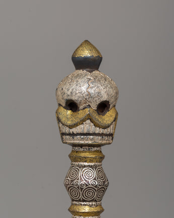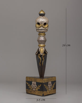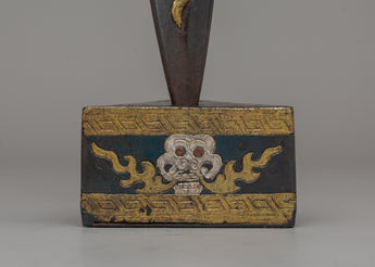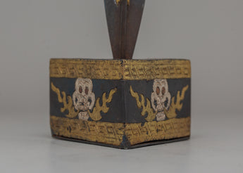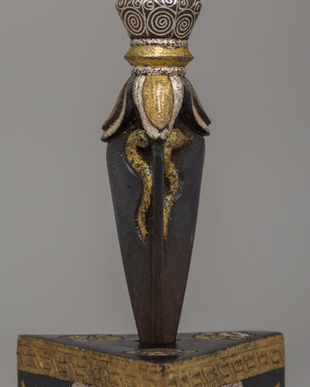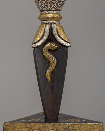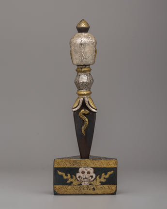 The Phurba's base is a meticulously crafted pedestal adorned with sacred symbol motifs that add to its potency. The base design represents Phurba's grounding aspect, ensuring that the energy of protection and spiritual strength is steadfast and unshakable. The overall appearance and craftsmanship of this Phurba make it a functional ritual tool and a beautiful piece of Tibetan religious art, representing the wisdom, strength, and protection it provides to its user.