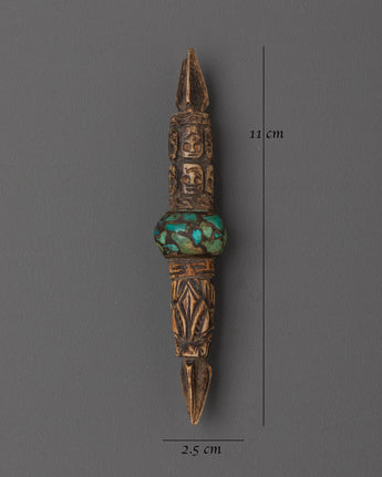 This Phurba Spiritual Cleansing Tool measures 11cm in height and 2.5cm in breadth, weighing approximately 0.020kg. This ceremonial blade, crafted from sustainably sourced buffalo bone and adorned with turquoise and simulated stones, is used in Tibetan Buddhist rituals for spiritual purification and protection. The exquisite carvings and turquoise embellishments make it not just a strong instrument but also an eye-catching spiritual item.