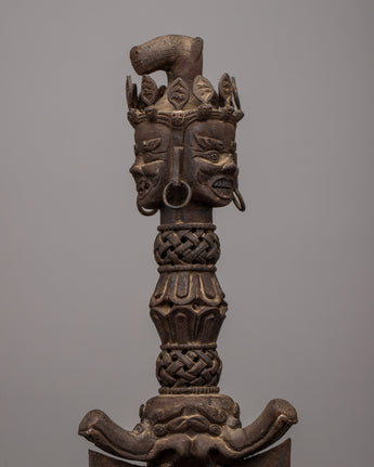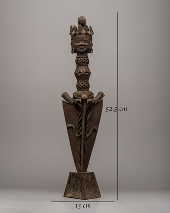 The Tibetan Phurba and its matching stand are more than just ornamental items; they reflect centuries of tradition and spiritual significance. This unique item is totally iron-carved and stands at an amazing height of 52.5 cm. It was handcrafted with great precision. Each detail symbolizes Tibetan culture's beauty and workmanship, giving the Phurba an atmosphere of ancient mystique and power.