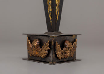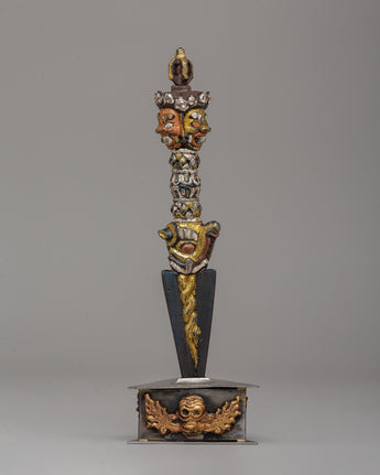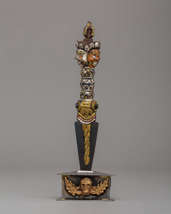 The Phurba sits on an elaborate pedestal adorned with patterns representing harmony and the interconnectedness of all things. These decorative elements represent balance and the ability to create order out of chaos. The fine inlays and overall structure elevate this Phurba from a spiritual tool to a one-of-a-kind piece of Tibetan art that combines craftsmanship, cultural significance, and purpose.