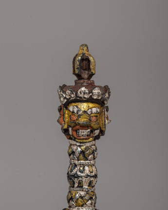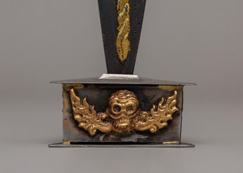 The central figure at the top of the Phurba represents a deity with three faces, each with a powerful expression. The three eyes represent the ability to see beyond ordinary perception, a critical component of spiritual awakening. The detailed headdress on the central figure represents divine wisdom and protection, essential for the Phurba's role during rituals. The dagger's shaft is embellished with intricate designs that evoke strength and the ability to overcome worldly distractions.