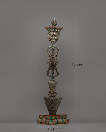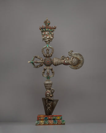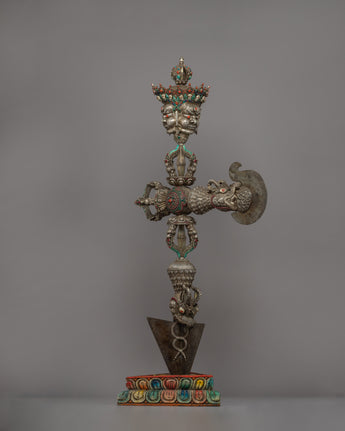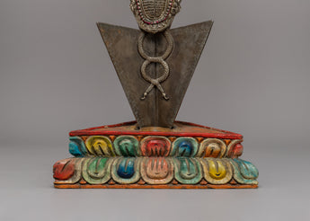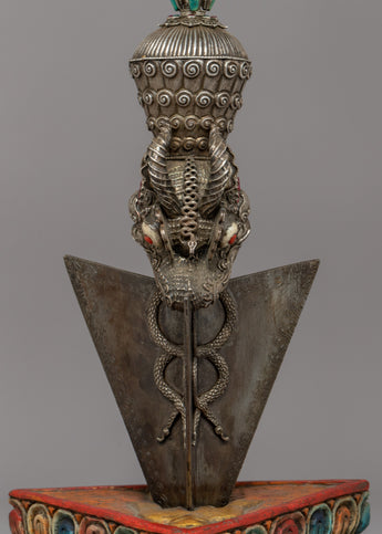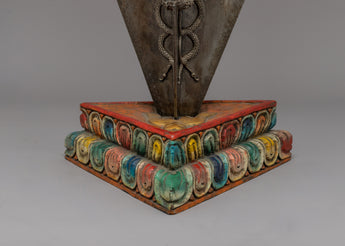 The Phurba is stable on a hardwood base fashioned in the shape of a double-petal lotus. The base's colorful design adds to the item's overall visual impact. This Phurba is a ceremonial tool and a captivating work of art. Each feature is carefully designed to represent spiritual protection, transformation, and the great energies in Tibetan Buddhist practice.