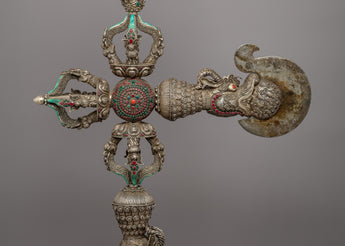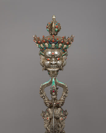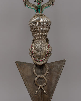This artistically carved Phurba, made of silver, contains a Heruka in the center and a skull head crown inlaid with gemstones. The Heruka's eyes are also decorated with gemstones representing spiritual insight and heavenly power. The Phurba has a Bishowa Vajra beneath its head, representing the essence of spiritual potency. A curved knife emerges from the mouth of a Makara, which has two finely carved horns, adding to its protective connotation. The Vajra is exquisitely ornamented with gemstones, and the three Vajra sides are covered with skull-like carvings, each in a single-petal lotus shape that represents the balance of life and death. The Vajra has turquoise engravings on each tip, which adds to its beauty and brilliance. Another Makara is carved beneath the Vajra, with three-edged swords protruding from its mouth, representing the destructive power that removes obstructions on the spiritual path. Two snakes slither downhill from the Makara's mouth, interweaving and symbolizing duality and metamorphosis. The careful craftsmanship and gemstone intricacies throughout the necklace add to its mystical energy and spiritual importance.
