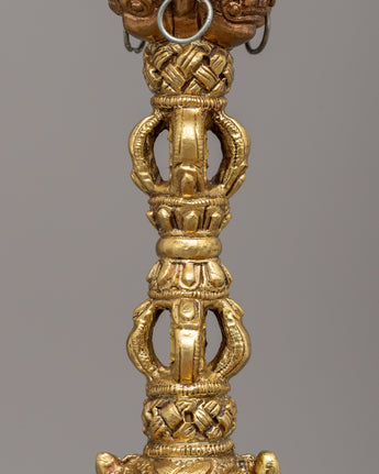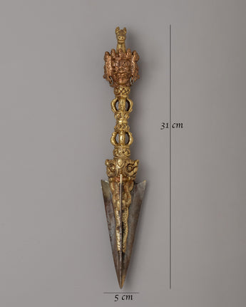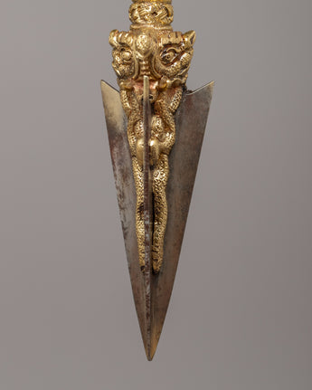 The design of the phurba is unique, combining not only the fearsome figure of Hayagriva but also a ceremonial tool used in spiritual practices for grounding, protection, and the removal of harmful energies. The elongated iron made blade tapers to a sharp point, symbolizing the ability to cut through illusions, while the sacred knots around the upper shaft add to its ritualistic power. The Hayagriva head gives this phurba a distinctive identity, representing a unique blend of divine power and spiritual protection, making it a central element in Tibetan ritual practices. The balance of brass, copper, and iron ensures durability while maintaining an aesthetically rich and symbolically powerful design.