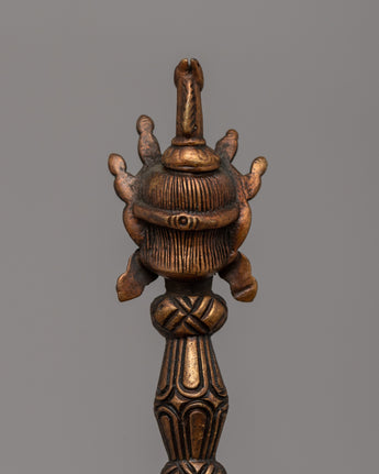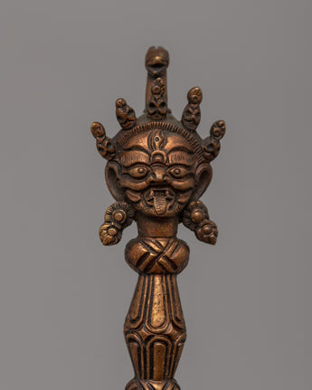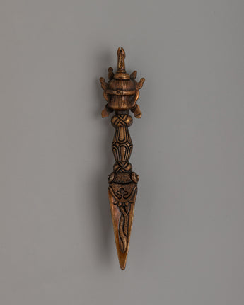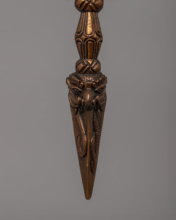 The Powerful Tool Tibetan Phurba, or the Vajrakila, is a sacred Buddhist ritual dagger used for spiritual protection and energy purification. This handcrafted Phurba is made of pure copper, with detailed details of wrathful deities representing the breakdown of opposing forces and barriers.