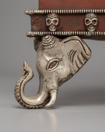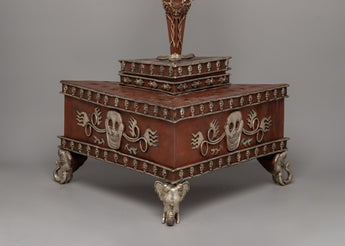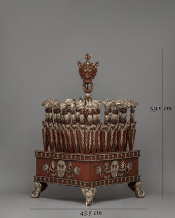 This Tibetan Phurba Collection (Set of 25) is a stunning exhibition of creativity and spiritual importance, evoking centuries of Tibetan culture. Each phurba is skillfully made with a copper body and exquisite silver plating, and it has an antique polish that adds to its ageless charm. The complete set is housed in a finely made box decorated with complex skull designs and symbolic engravings, adding to its ceremonial and aesthetic appeal. With a height of 59.5 cm, a width of 45.5 cm, and a weight of 20.0 kg, this set is an impressive centerpiece for any spiritual practice or collection.