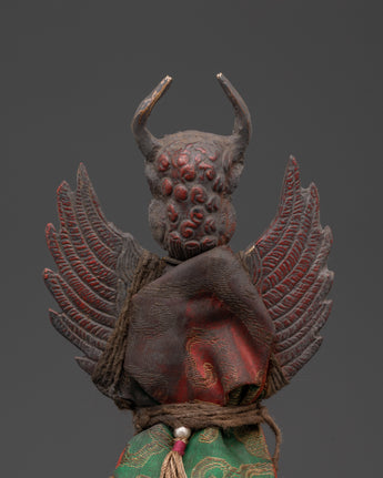 The Phurba is widely regarded as a protective instrument, with the power to repel bad energy and spirits. It has a distinctive Iron Body that lends power and durability to the god it depicts. The Phurba is intricately designed, featuring traditional Tibetan imagery with its sharp blade-like edge and the protecting figure associated with ritualistic usage. The figure's position and furious look suggest its use in exorcism rituals and spiritual protection, making it a vital instrument in Tibetan customs.