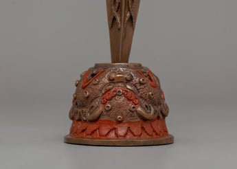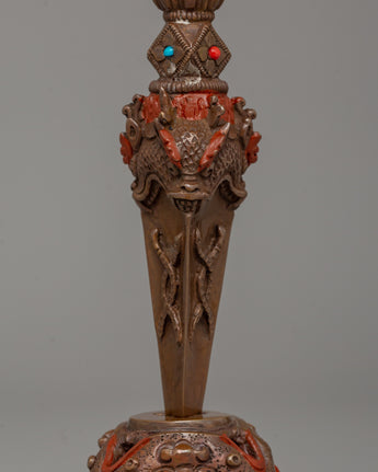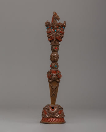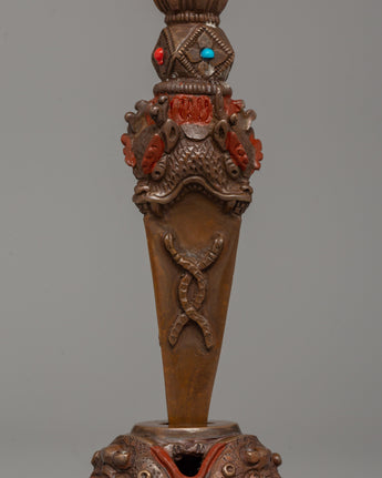 The shaft of the Phurba is adorned with intricate details, demonstrating the exceptional craftsmanship of Tibetan artisans. The base is stable, firmly supporting the dagger while serving as a powerful purification tool. The vibrant colors of the stones contrast with the oxidized copper body, adding to the Phurba's commanding presence. This piece is functional ritual art and a symbol of sacred protection, making it a prized possession for any practitioner.