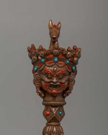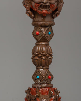The Phurba's top features a fierce, dynamic face that emphasizes its protective qualities. The face is embellished with turquoise and coral accents, which are thought to enhance the Phurba's protective energy and spiritual clarity. These stones are strategically placed to add potency to rituals, improving the user's spiritual intent and strength.