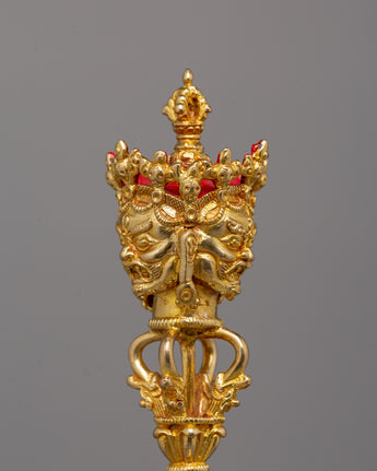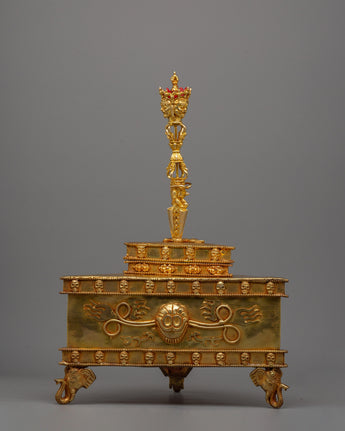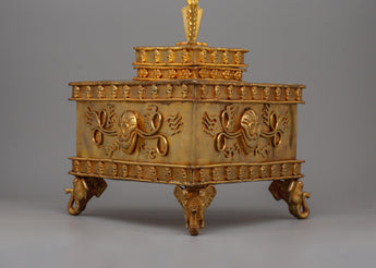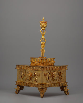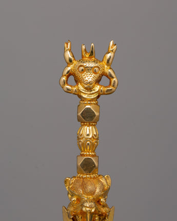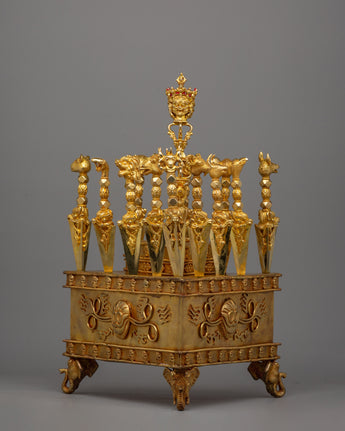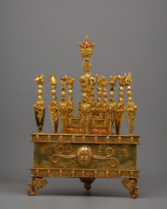Our excellent Ritual Dagger Phurba Set is a fine example of ancient Buddhist craftsmanship, with a premium copper body and delicate gold plating. This artifact, which measures 45.5 cm in height and 32 cm in width and weighs 8.71 kg, is not only visually appealing but also serves as a spiritual symbol. The Phurba, which is treasured in Buddhist rites, is a powerful ceremonial item used to expel evil energy and channel divine blessings.