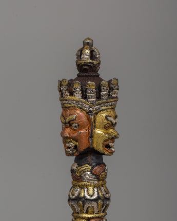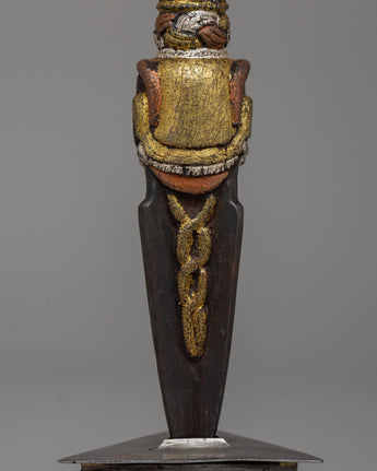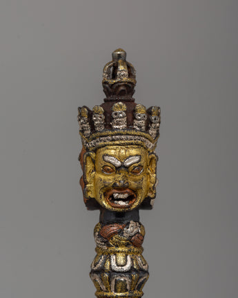 The top of the dagger has a captivating three-faced figure, each with detailed facial expressions and three eyes. This design embodies the Phurba's fierce and transformative nature, which is used to overcome obstacles and ignorance. The crown-like headdress worn by the central figure adds another layer of symbolism, representing divine wisdom and protection. The unique craftsmanship of this element captures the essence of the Tibetan Buddhist tradition, in which the Phurba is a powerful tool for spiritual control and security.