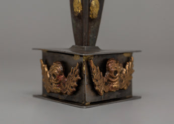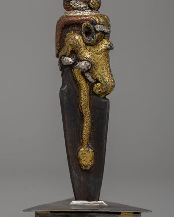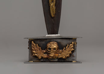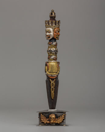 The handle and base are equally impressive, with fine inlays reflecting the object's spiritual significance. Traditional carvings on the base complement the overall design, representing balance and harmony in the universe. The intricate craftsmanship in every detail of this Phurba elevates it from a mere ritual object to a elevates this Phurbacombines art, spirituality, and purpose.