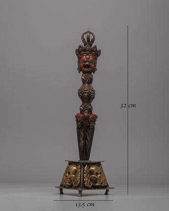 The Sacred Phurba Ritual Dagger is a stunning ceremonial artifact made of brass with an oxidized finish and resting on an artistically carved iron base. This Phurba, measuring 32 cm tall and 13.5 cm wide and weighing 1.50 kg, represents both strength and divine artistry. Its sturdy materials and antique polish emphasize its spiritual significance, making it an important component in traditional Vajrayana Buddhist ceremonies for eliminating negativity and invoking protection.