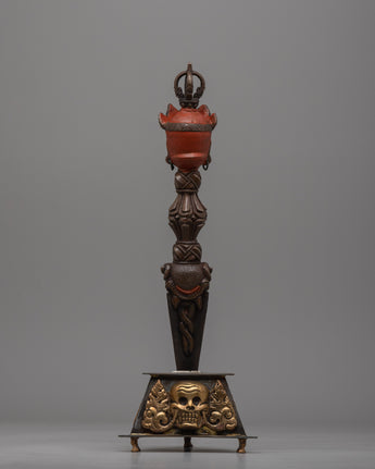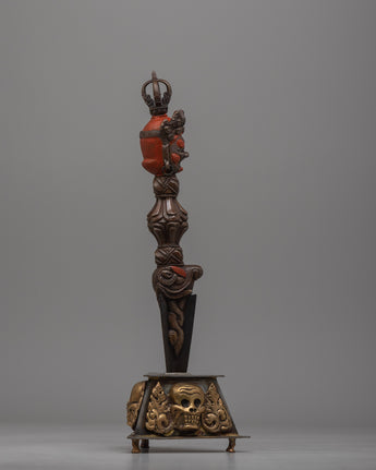 This Phurba has an imposing deity figure at the top, oozing power and authority. The blade's intricate engravings reflect the unification of conflicting forces, symbolizing harmony and spiritual balance. The iron foundation, which is embellished with skull designs, represents the change of ignorance and ego into wisdom and awakening. This Phurba is often utilized in tantric ceremonies and is acclaimed for its capacity to channel energies, overcome obstacles, and help practitioners achieve spiritual focus and freedom. Its excellent craftsmanship and symbolic profundity make it a powerful depiction of Buddhist rituals.
