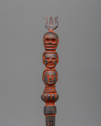 At the top of this magnificent dagger is the Trishul, a three-bladed spear that represents the transcendence of the three primary causes of suffering: ignorance, attachment, and aversion. These upward-facing blades represent divine force, purity, and the sharp insight required to conquer life's illusions. The three beautifully crafted skull heads beneath the Trishul signify impermanence, the cycle of life, death, and rebirth, as well as the emancipation that comes with spiritual realization. The dagger's base features a triangular-shaped blade, representing stability, focus, and the power to cut through delusion and obstructions. This ritual dagger, embellished with intricate Buddhist art and motifs, is not just a sacred implement but also a profound symbol of transformation, strength, and enlightenment, providing a deep link to old spiritual wisdom.