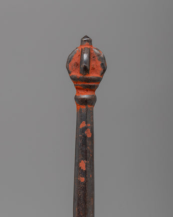 Ritual tools are vital equipment of Tibetan Vajrayana Buddhism practice, meant to dispel misconceptions that obstruct enlightenment. The phurba (Sanskrit: Kila) blade seen here was created to symbolically swallow the three poisons that obstruct spiritual progress: ignorance, greed, and illusion. The Phurba is the physical manifestation of the Vajrakila Buddha, who has the ability to destroy all evil on the earth. Its ceremonial usage is first recorded in the Vajrakilaya Tantra, an eighth-century or older Vajrayana work.